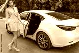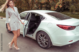 woman opens door business taxi sedan, business class taxi car, fashionable modern fashion girl, car sharing rental. Strict guest lady business, autumn summer, background trees road white car.