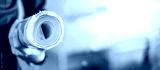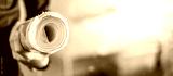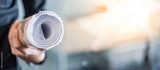 Male architect or civil engineer hand holding rolled blueprints or architectural drawing paper at construction site. Architecture and building construction industry.