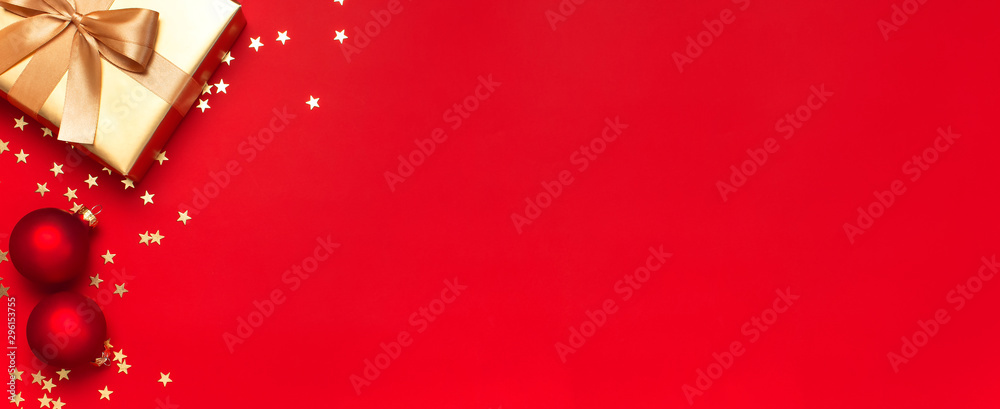 Flat lay Xmas holiday 2020 celebration. New Year Christmas golden presents with ribbon, Christmas balls, gold confetti stars on red background top view. Gift boxes greeting card Festive decorations