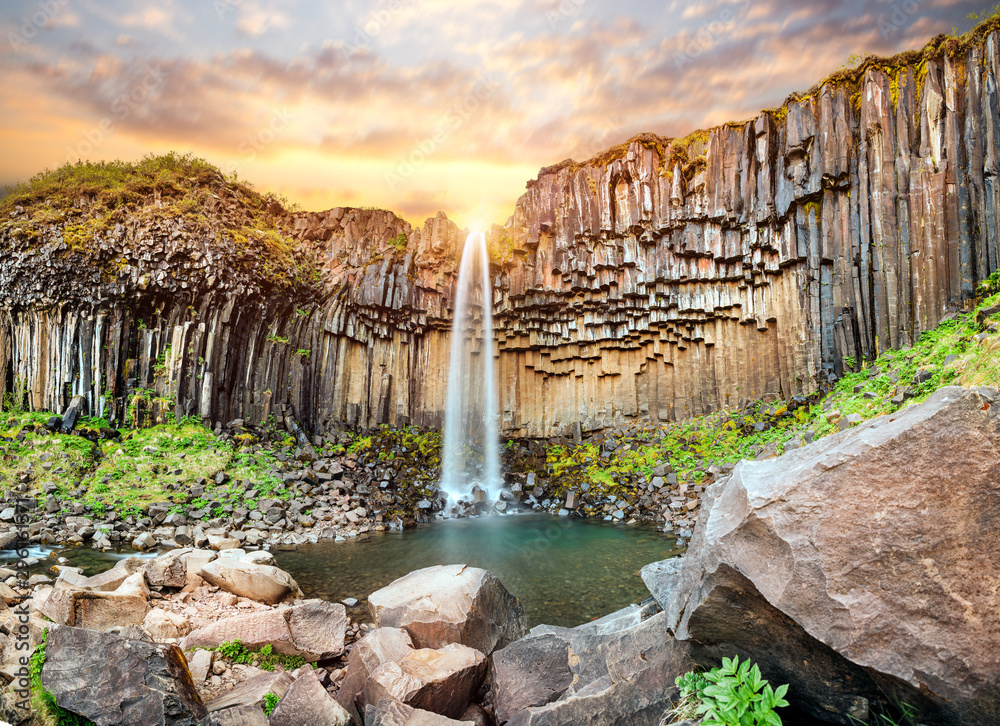 Sunset over beautiful Svartifoss waterfall. Location Skaftafell National Park, Vatnajokull glacier, Iceland, Europe.