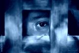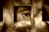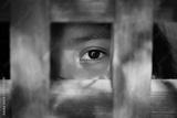 The blank stare of a child's eye who is standing behind what appears to be a wooden cage to convey captivity, or bondwoman.