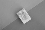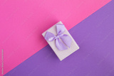 Gift with violet bow on the colorful background.Top view.Copy space.