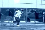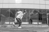 dancer dancing break dance, hip hop. In summer city, background glass windows. Active youth lifestyle, young male dancer, fitness workout breakdancer jeans sneakers, sunglasses. Free space for text.