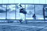 Handstand dancer dancing break dance, hip hop. In summer city, background is glass windows. Active youth lifestyle, young male dancer, fitness workout. In jeans sneakers, sunglasses. Free space text.