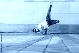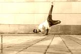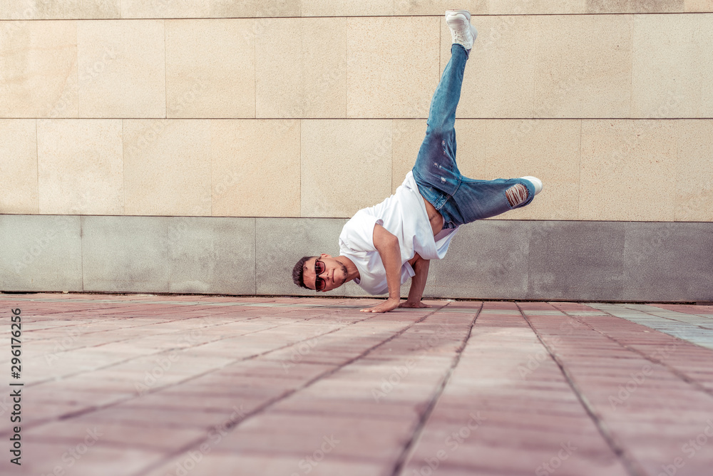 Dancer acrobat handstand dancing break dance, hip hop. Summer city, background wall. Active youth lifestyle, male dancer fitness workout breakdancer. In t-shirt jeans sunglasses. Free space for text.
