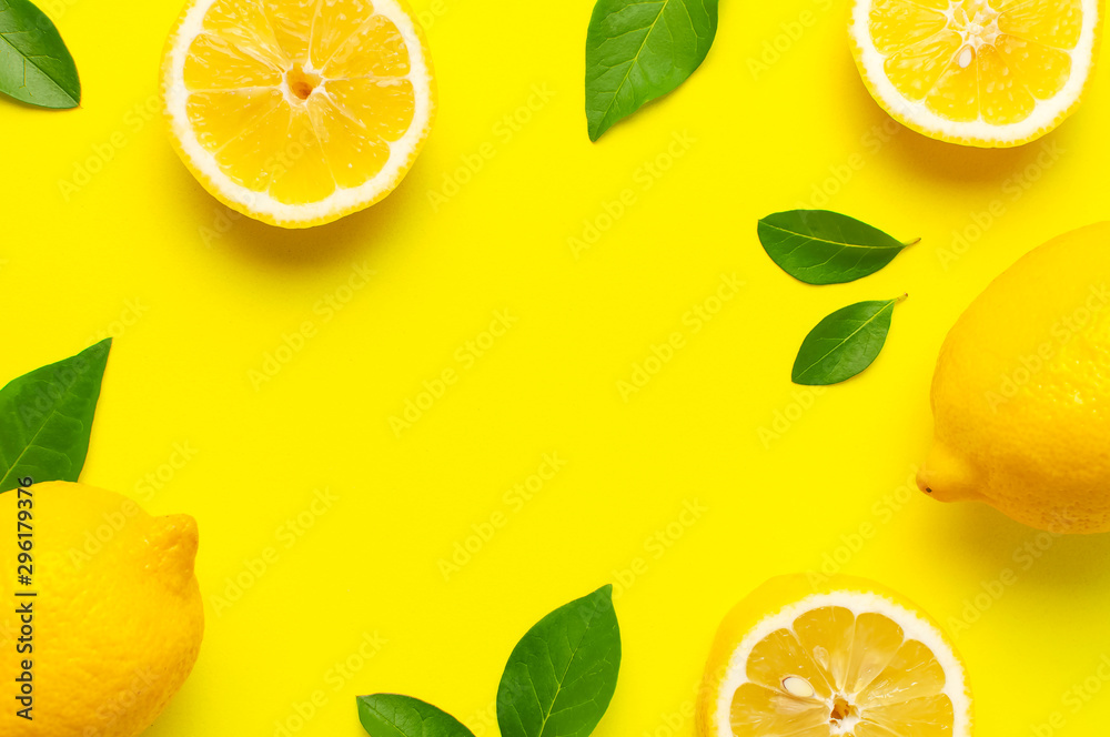 Creative background with fresh lemons and green leaves on bright yellow background. Top view flat lay copy space. Lemon fruit citrus minimal concept vitamin C. Composition with whole, slices of lemons