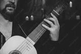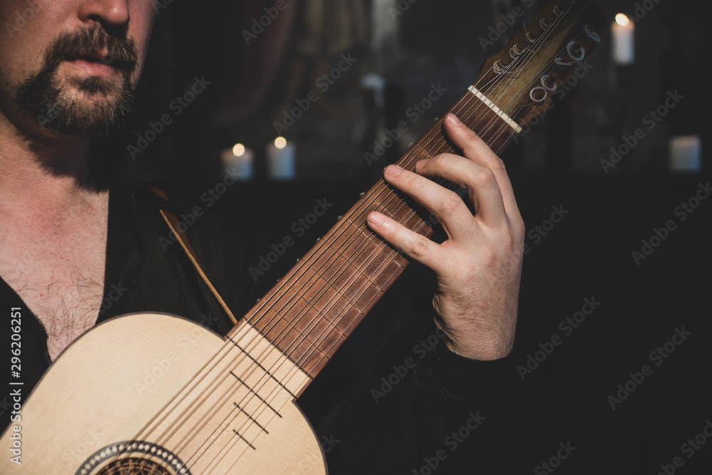 Adult man in historical suit playing vihuela....