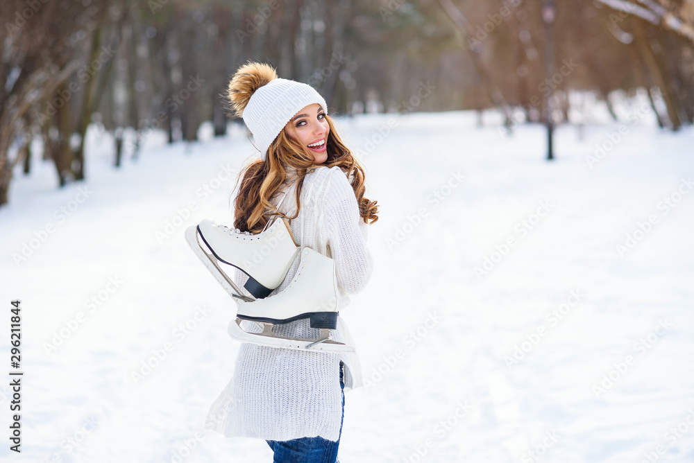 Beautiful woman weared in white sweater and hat with ice skates on the back walks in winter snowy park.