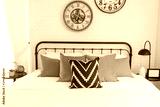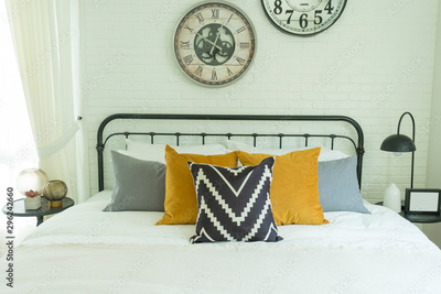 Modern and stylish of a cozy bedroom with yellow, blue, and grey pillow on bed