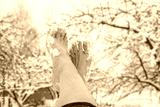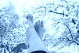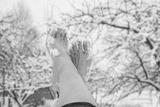 female bare feet, toes in the snow on a frosty winter day against a garden, hardening the body