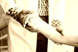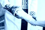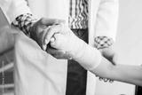 Close-up of man doctor of checking splint the arm of female patient hand due to with her arm broken for better healing with a smile sit in a wheelchair In the room hospital background.