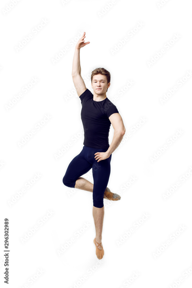 Actor Russian ballet,young ballet dancer performing complex elements on a white background