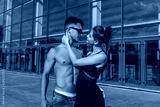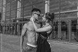 Young couple, guy girl, dancers actors break dance. In summer city. Active youth lifestyle, fitness movement, workout breakdancer concept passion love and kisses. Athletic inflated press in men.