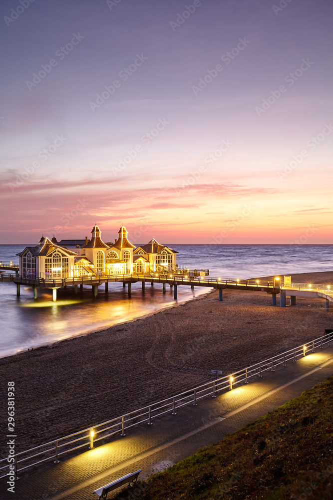 Beach in Sellin, the Jewel of Rugia (Ruegen) Baltic Coast island at purple sunrise, Germany.