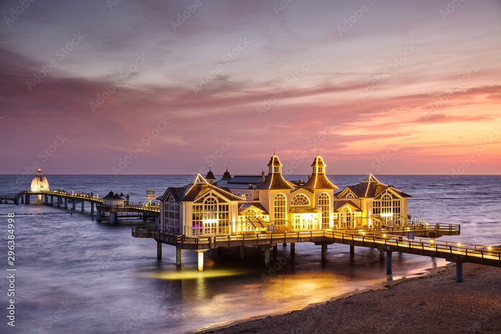 Pier in Sellin, the Jewel of Rugia (Ruegen) Baltic Coast island at purple sunrise, Germany.