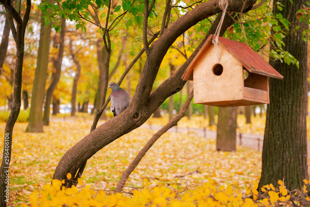 pigeon sits on a grass near a bird feeder in autumn , yellow fallen leaves