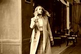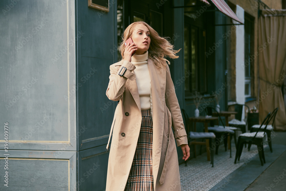 Attractive casual blond girl in stylish trench coat talking on cellphone on street
