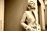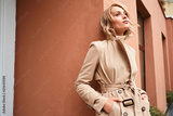 Beautiful stylish blond girl in trench coat dreamily looking away outdoor