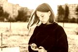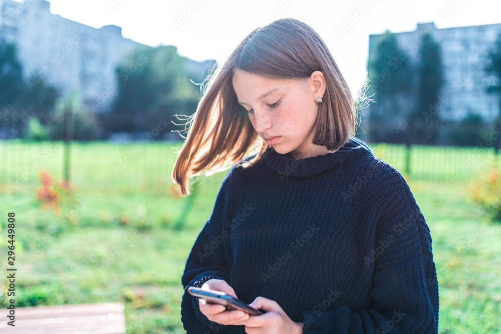 Girl teenager schoolgirl, summer city background is green grass, warm sweater, holding mobile phone, reading and writing a message, online application on social networks Internet.