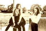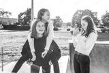 Three girls schoolgirls girlfriends, teenagers having fun taking pictures phone. Video recording. In summer city nature fall, happy people warm sweaters play, relax after school emotions joy delight.