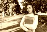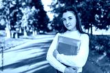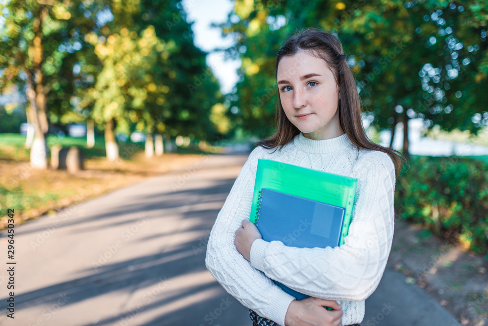Teenage girl schoolgirl, teenager white sweater summer city, background trees road, warm sweater, hands notebooks books and folders, smiling happy, after lessons school institute free space for text.
