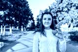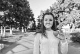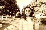 Teenage girl schoolgirl, teenager white sweater autumn in city background trees road, warm sweater, in hands of toy heart, gift and help, donation and love, free space for text.