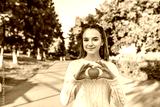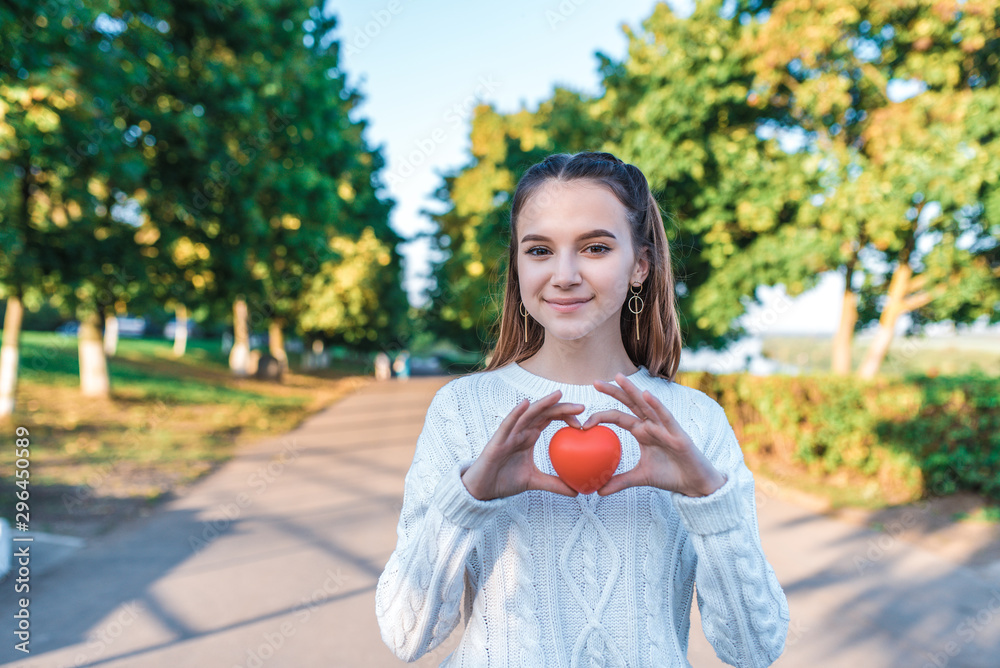 Girl teenager schoolgirl, congratulations Valentine's Day, white sweater autumn background trees road, warm sweater, in hands of toy heart, gift and help, donation and love, free space for text.