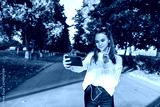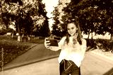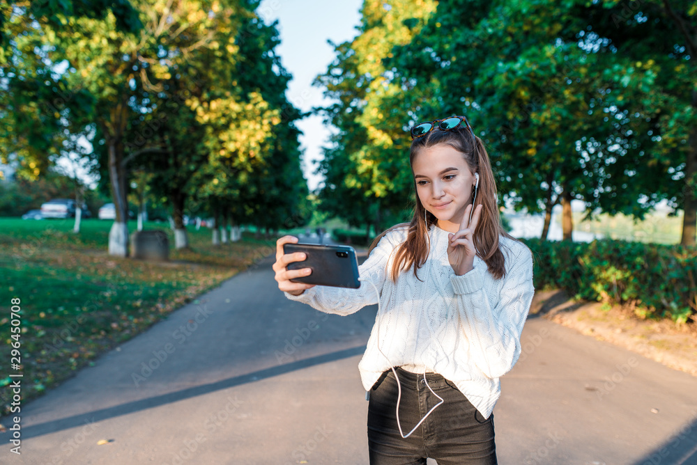 Teenage girl schoolgirl, teenager headphones taking pictures themselves phone, happy smiling having fun, recording video, video call, autumn summer city, white sweater, jeans. Background trees road.