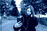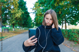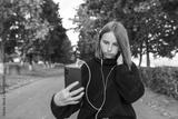 teenage girl schoolgirl, teenager with headphones taking photos themselves phone, serious girl listens conversation, recording, video call, autumn summer city, black sweater. Background trees road.