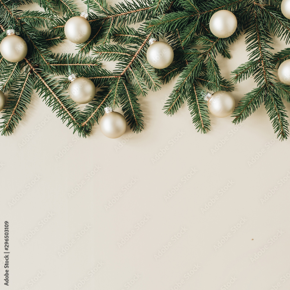 Christmas / New Year holiday composition. Fir needle branches, Christmas bauble balls on beige background. Flat lay, top view festive hero header.