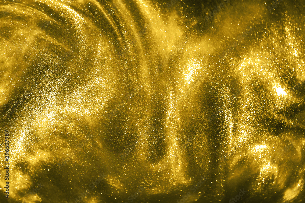 Abstract gold festive glitter magic shimmering luxury background. Festive sparkles and lights. de-focused