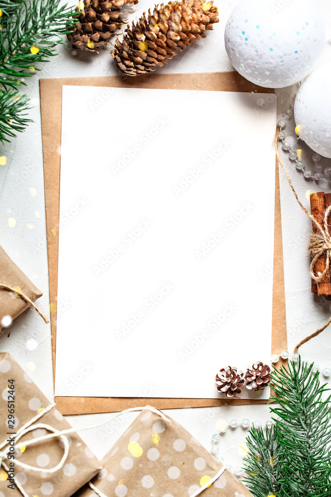 Merry Christmas and happy New year. Mockup with postcard and branches of a Christmas tree on white background.Background with copy space. Selective focus. Top view. Christmas background.