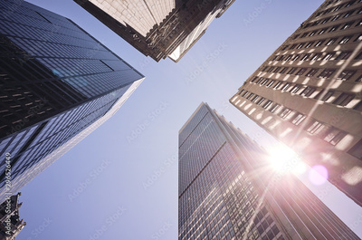 Looking up at New York skyscrapers against the sun with lens flare, color toned picture, USA.