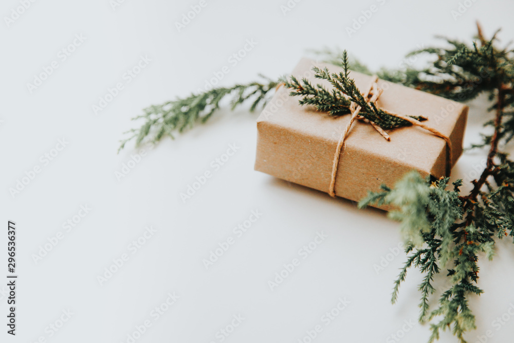 Bright green twigs of pine tree and a light brown gift box on the white background. Isolated Copyspace christmas flat lay concept.