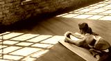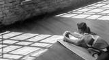 Sporty fit active young woman in sportswear warm up stretch on wooden floor sit on mat in gym studio, female healthy girl do sport workout exercise fitness class training concept, copy space top view