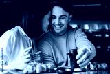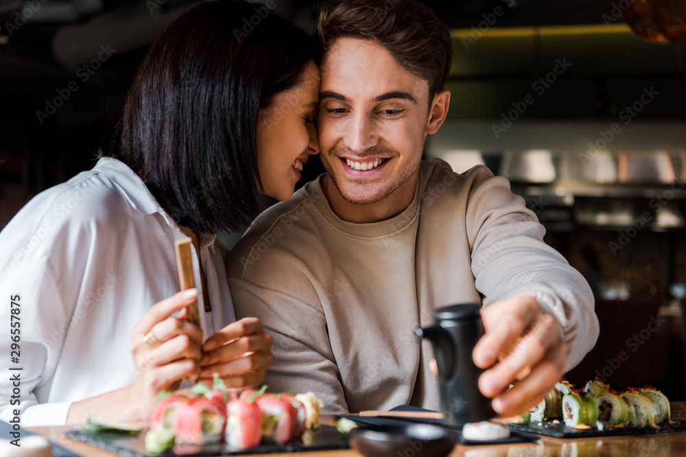 selective focus of cheerful man holding black bottle near woman and sushi
