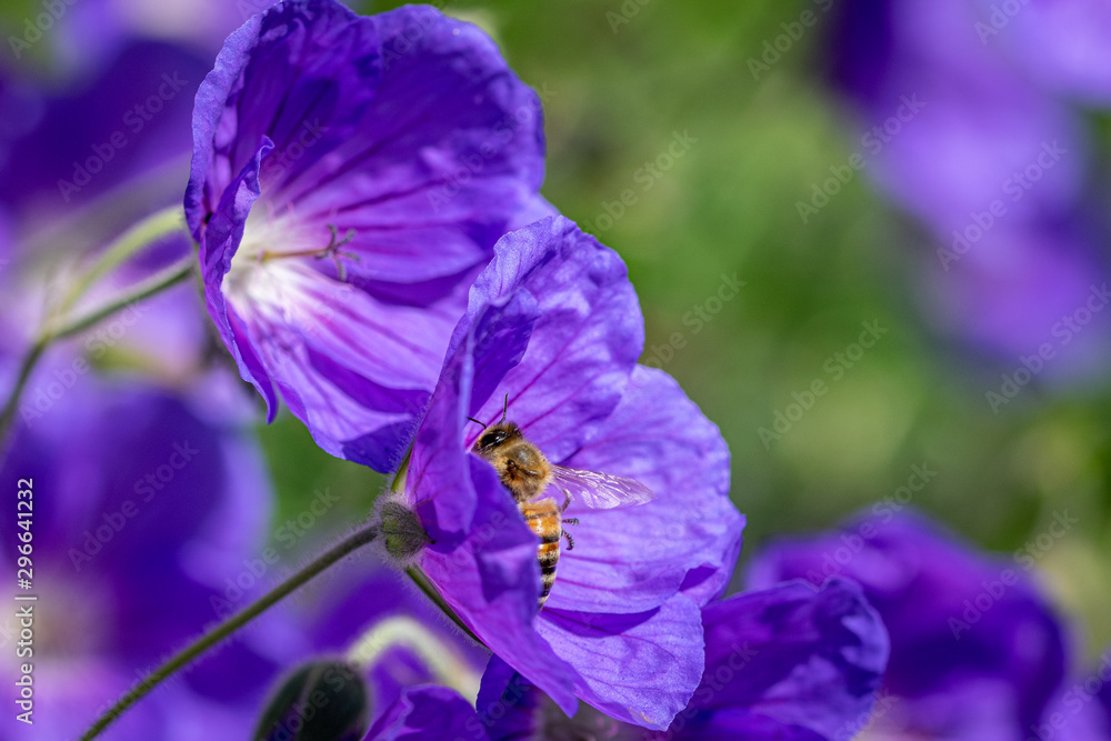 Honeybee collecting nectar from purple flower in bloom