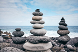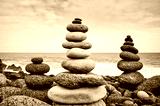 Stone stacks on a beach, balance and harmony concept, color toning applied, selective focus.