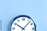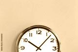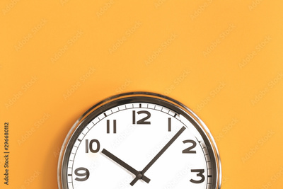 Part of analogue plain wall clock on trendy pastel orange background. Ten o'clock. Close up with copy space, time management or school concept and summer or winter time change