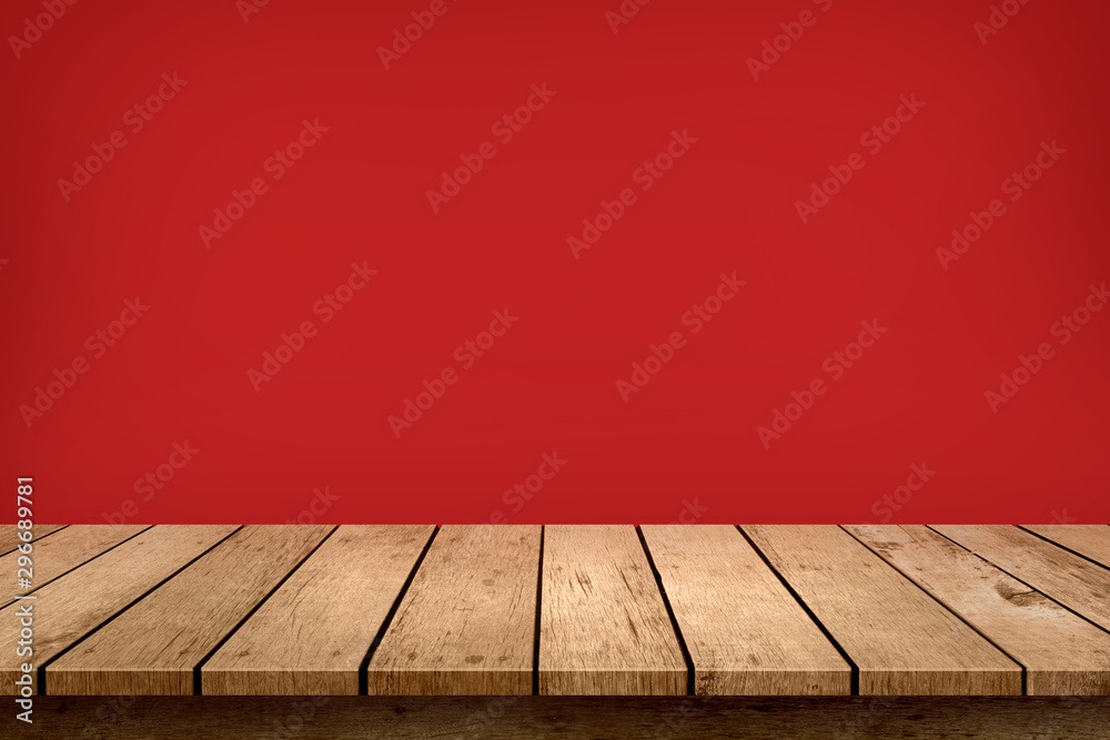 Empty wooden table top on pastel red colour background. Used for halloween or black friday display or montage your products.