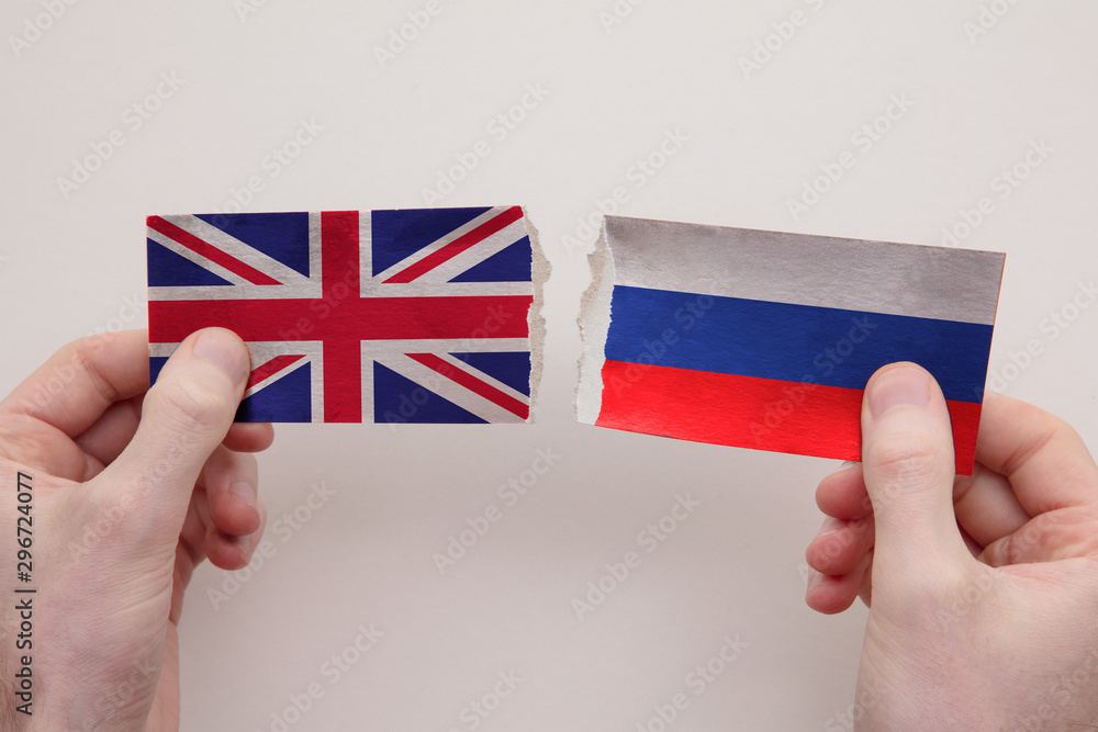 UK and Russia paper flags ripped apart. political relationship concept