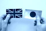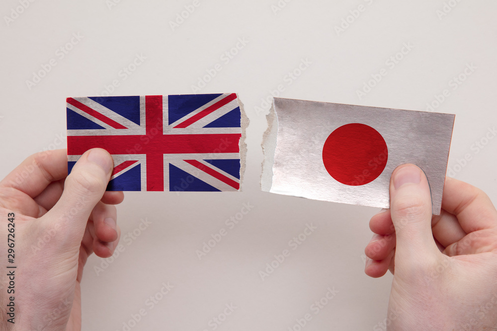 UK and Japan paper flags ripped apart. political relationship concept