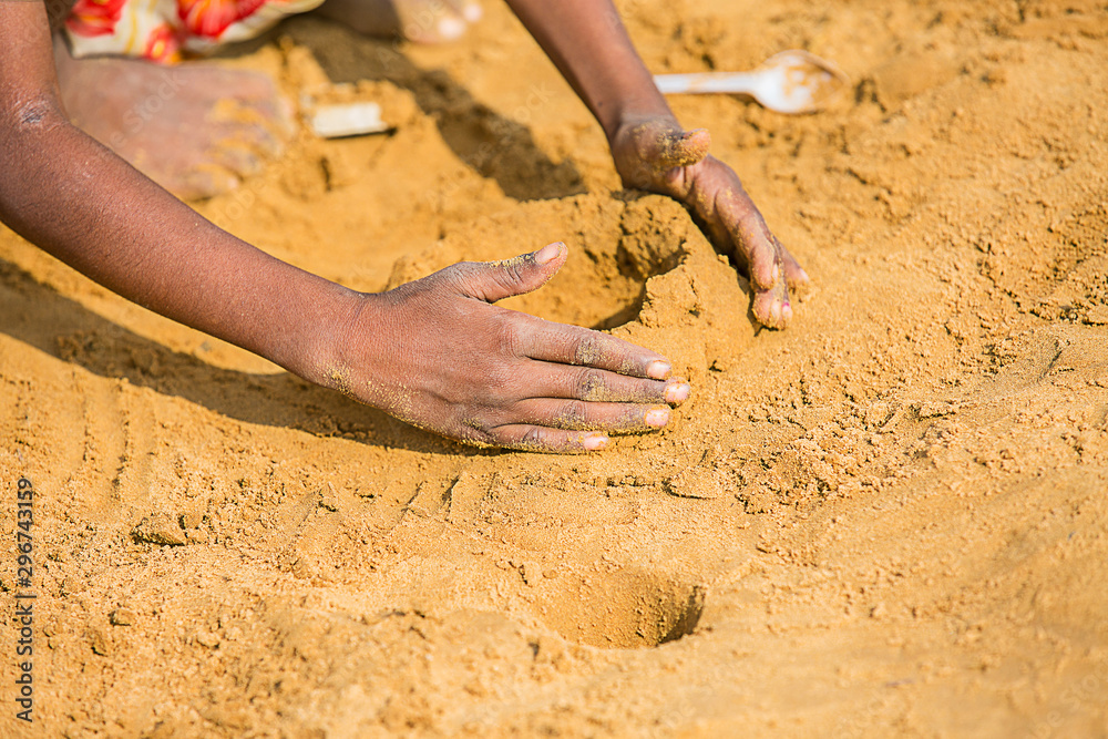 Closeup of kid hand playing with sand in hot summer. poverty concept