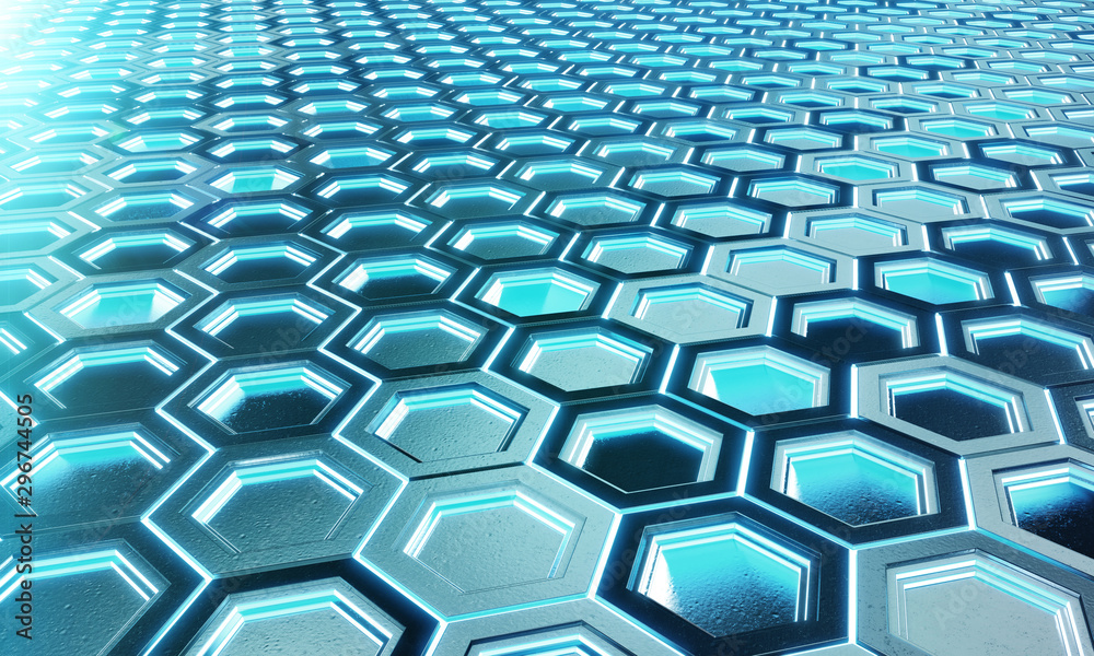 Glowing black and blue hexagons background pattern on silver metal surface 3D rendering