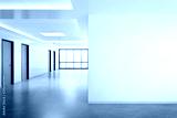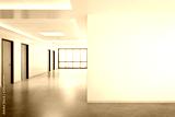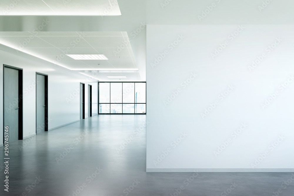 Blank wall in office mockup with large windows and sun passing through 3D rendering