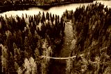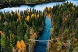 Aerial view of river with suspension bridge in colorful autumn forest in Finland.