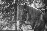 Closeup of a domestic horse on natural background outdoors rural scene. Side view