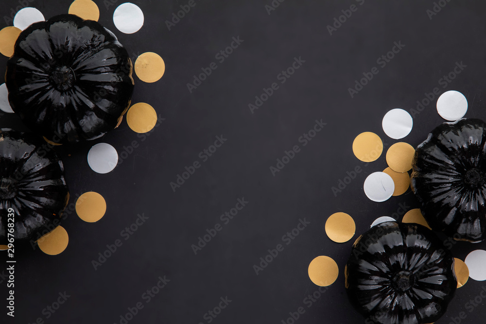 Black halloween lay flat composition with black pumpkins