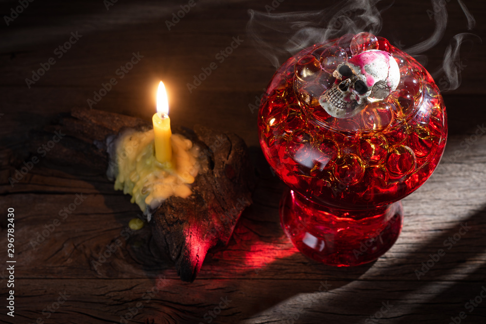 Halloween welcome drink with skull and hot transparent ball and candlelight on old wooden table