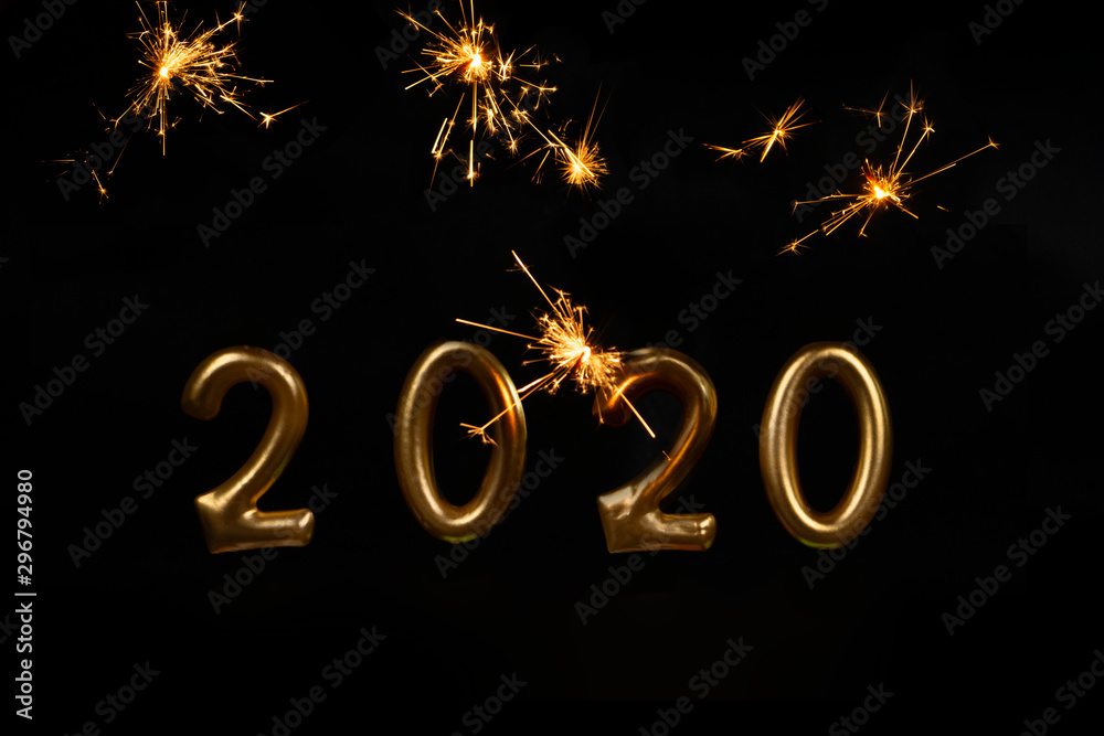 2020 numbers of golden color with fire stars on black background. New Year's celebration. Christmas party decoration.